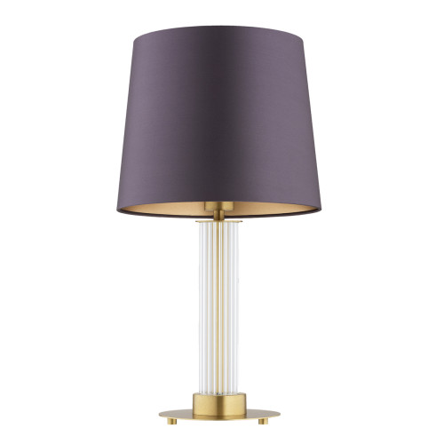 Съвременна настолна лампа от серията Hampton, изработена от месингова основа с набраздено прозрачно стъклено тяло в цилиндрична форма и текстилна шапка в лилав цвят отвън и златист във вътрешността. Стилно предложение за интериорното осветление на вашия хол, трапезария, спалня, кабинет, хотел и ресторант.