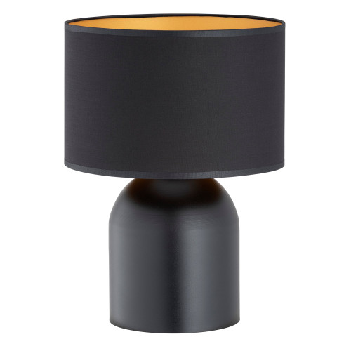 Оригинална настолна лампа в модерен стил от серията Aspen, изработена от черен цвят метална основа и цилиндрична текстилна шапка в черен цвят отвън и златист отвътре. Стилно допълнение за интериорното осветление на вашия хол, трапезария, спалня, кабинет, хотел и ресторант.