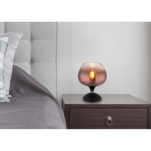 Елегантна настолна лампа с модерен дизайн от серията Maxy, изработена от черен цвят метална основа и куполовидна форма стъклена чашка в цвят мед, преливащ към прозрачен. Оригинално решение за интериорното осветление във вашия хол, трапезария, спалня, офис, хотел и ресторант.