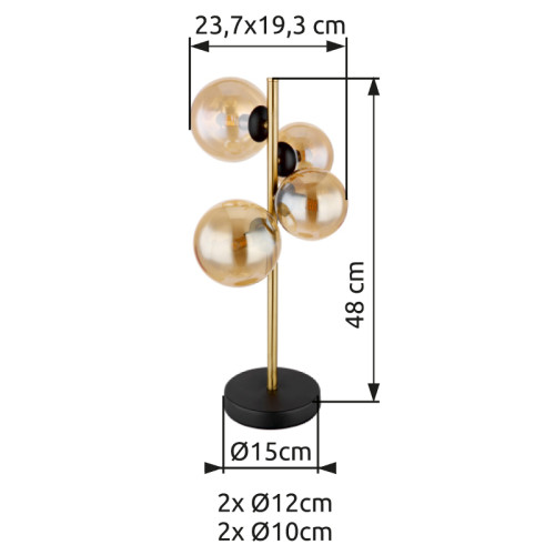 Модерна настолна лампа със стилен дизайн от серията Riha, изработена от черен цвят метална основа и цвят месинг метално рамо с четири сферична форма стъклени чашки в цвят кехлибар. Оригинално предложение за комфортното осветление във вашия хол, трапезария, спалня, хотел и ресторант.
