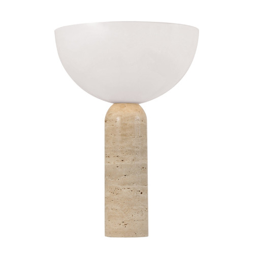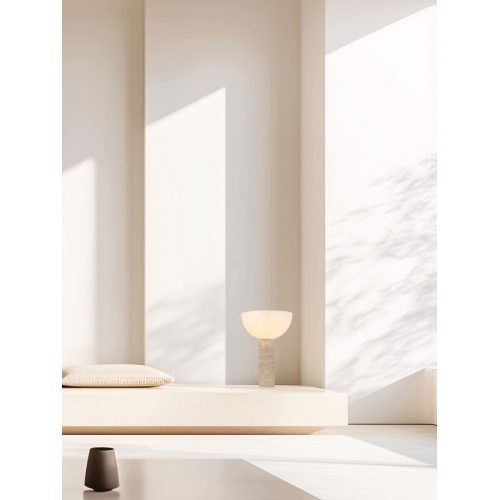 Оригинална настолна лампа с модерен дизайн, изработена от натурална каменна основа и опал акрилна шапка в полусферична форма. Стилно допълнение за интериорното осветление на вашия хол, трапезария, спалня, кабинет, хотел и заведение.
