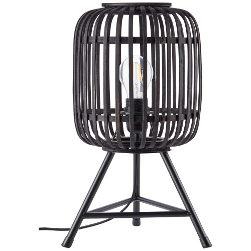 Стилна настолна лампа с оригинален дизайн от серията Woodrow, изработена от черен цвят трикрака метална основа и отворена декоративна шапка от тъмно кафяв ратан в овална форма. Модерна лампа, която ще изпълни с комфорт и отлична светлина вашия хол, трапезария, спалня, хотел и заведение.