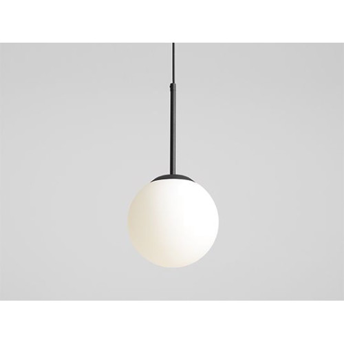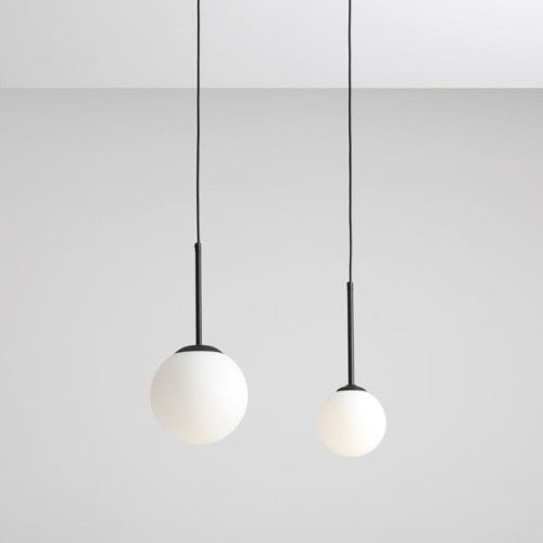 Елегантен пендел в минималистичен стил от серията Bosso, изработен от черен цвят метална основа и матово бял цвят сферична стъклена чашка на цокъл Е27. Модерно предложение за комфортно осветление на вашия хол, трапезария, спалня, хотел и заведение.