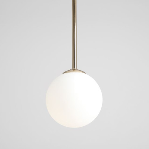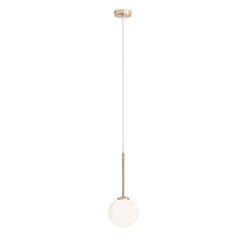 Елегантен пендел в минималистичен стил от серията Bosso, изработен от златист цвят метална основа и матово бял цвят сферична стъклена чашка на цокъл Е14. Модерно предложение за комфортно осветление на вашия хол, трапезария, спалня, хотел и заведение.