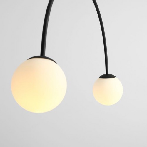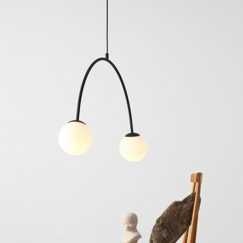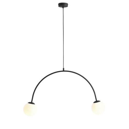 Оригинален пендел с модерен дизайн от серията Lea, изработен от черен цвят кръгла метална основа и дъгообразно извито метално тяло с две бял мат сферични стъклени чашки на цокъл Е14. Стилно предложение за интериорното осветление на вашия хол, трапезария, спалня, хотел и заведение.
