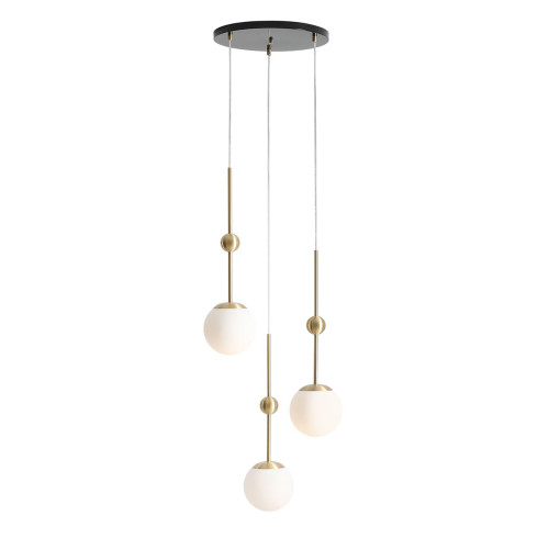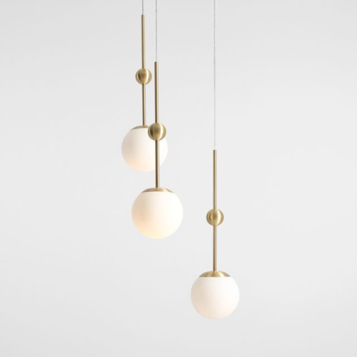 Класически пендел в модерен стил от серията Mae, изработен от кръгла основа и висящи месингови тела със сферичен декоративен детайл и три бели стъклени чашки на цокъл Е27. Оригинално решение за интериорното осветление на вашия хол, трапезария, спалня, хотел и заведение.
