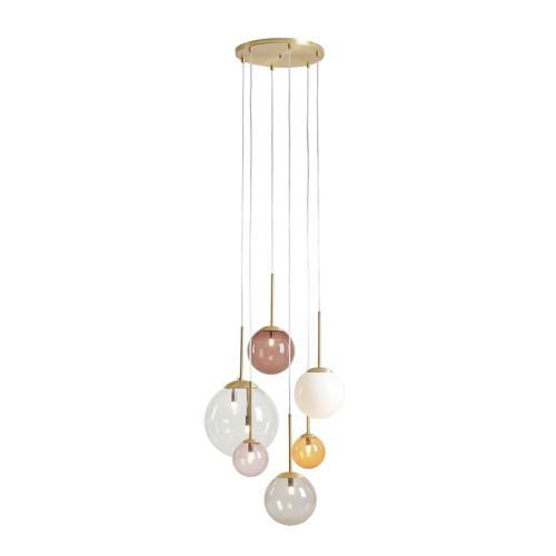 Елегантен пендел в минималистичен стил от серията Bosso, изработен от цвят месинг кръгла метална основа и висящи цилиндрични метални елементи с шест сферични многоцветни стъклени чашки. Модерно предложение за комфортно осветление на вашия хол, трапезария, хотел и заведение.