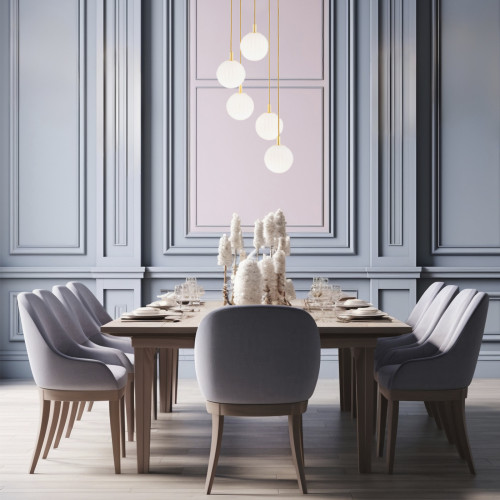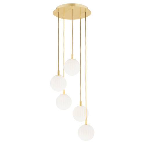 Стилен пендел от серията Paloma, изработен от кръгла месингова основа и висящи на различна височина пет сферична форма чашки от опал мат набраздено стъкло. Изискано предложение за качественото и комфортно осветление на вашия хол, трапезария, спалня, хотел и ресторант.
