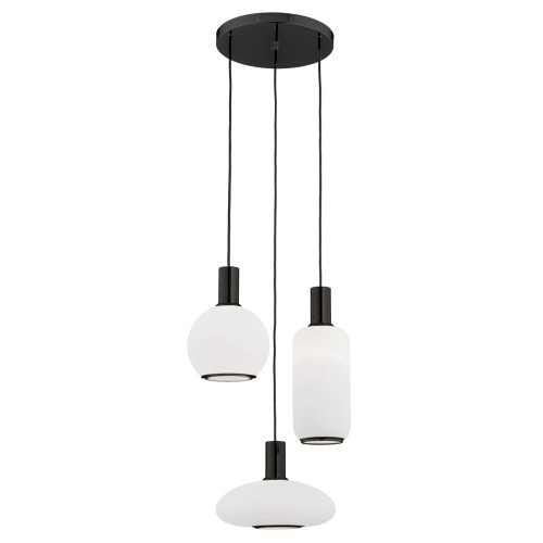 Модерен пендел с елегантен дизайн от серията Sagunto Plus, изработен от черен цвят метална основа и три различна форма опал стъклени чашки с метален кант отдолу. Оригинално решение за интериорното осветление във вашия хол, трапезария, спалня, хотел и заведение.