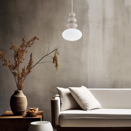 Модерен и стилен пендел от серията Diego, изработен от метална основа и оригинална форма стъклено тяло в сив цвят с опал мат стъклена чашка на цокъл GU10. Оригинална висяща лампа, подходяща за комфортното осветление на вашия хол, трапезария, спалня, хотел и заведение.