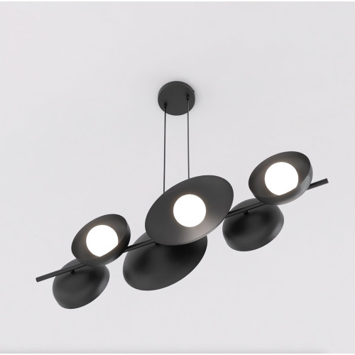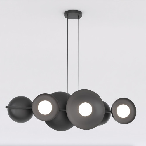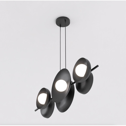 Оригинален пендел с минималистичен дизайн от серията Volum, изработен от черен цвят метална основа и висящо метално рамо с геометрична форма тяло, съставено от шест различни по размер метални чашки в черен цвят с опал стъклени сферични разсейватели. Модерно предложение за интериорното осветление на вашия хол, трапезария, офис, хотел и ресторант.