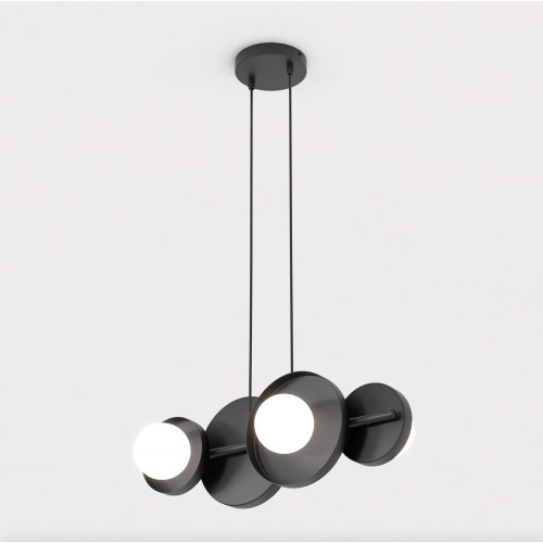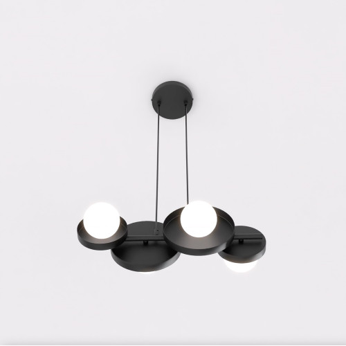 Стилен пендел с уникален дизайн от серията Model, изработен от черен цвят метална основа и геометрична форма тяло, съставено от четири кръгли метални чашки в черен цвят и опал стъклени разсейватели на цокъл G9. Модерно предложение за интериорното осветление на вашия хол, трапезария, офис, хотел и ресторант.
