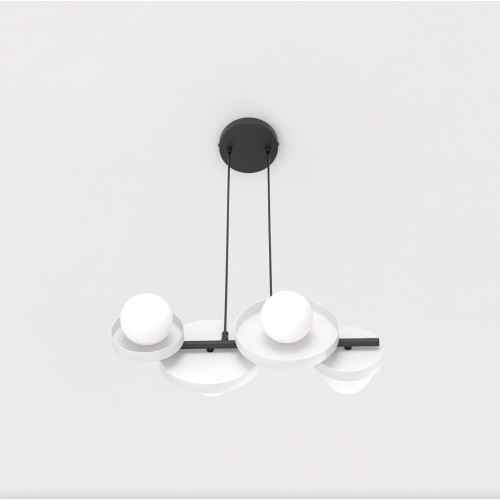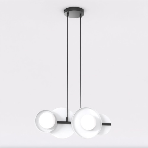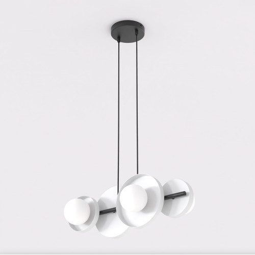 Стилен пендел с уникален дизайн от серията Model, изработен от черен цвят метална основа и геометрична форма тяло, съставено от четири кръгли метални чашки в бял цвят и опал стъклени разсейватели на цокъл G9. Модерно предложение за интериорното осветление на вашия хол, трапезария, офис, хотел и ресторант.