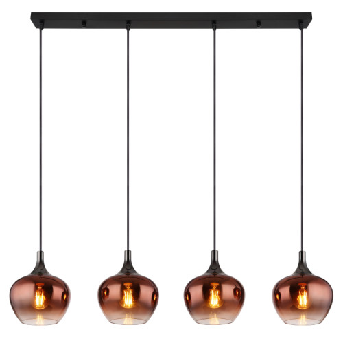 Елегантен пендел с модерен дизайн от серията Maxy, изработен от черен цвят метална основа и четири куполовидна форма стъклени чашки в цвят мед, преливащ към прозрачен. Оригинално решение за интериорното осветление във вашия хол, трапезария, хотел и ресторант.