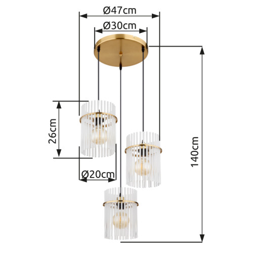 Стилен пендел с изискан дизайн от серията Gorley, изработен от матово златист цвят метална основа и три цилиндрична форма декоративни чашки от опал стъклени пръчици с прозрачно блендиране. Чудесно предложение за комфортното осветление на вашия хол, трапезария, хотел и заведение.