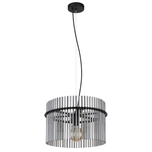 Стилен пендел с изискан дизайн от серията Gorley, изработен от матово черен цвят метална основа и цилиндрична форма декоративна шапка от опушени стъклени пръчици. Чудесно предложение за комфортното осветление на вашия хол, трапезария, спалня, хотел и заведение.