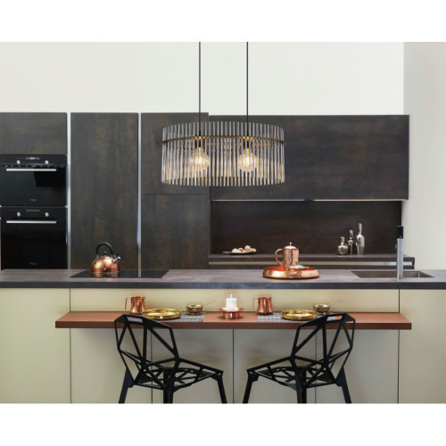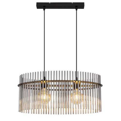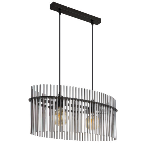 Стилен пендел с изискан дизайн от серията Gorley, изработен от матово черен цвят метална основа и елипсовидна форма декоративна шапка от опушени стъклени пръчици. Чудесно предложение за комфортното осветление на вашия хол, трапезария, спалня, хотел и заведение.