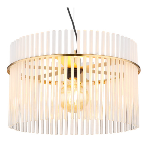 Стилен пендел с изискан дизайн от серията Gorley, изработен от матово златист цвят метална основа и цилиндрична форма декоративна шапка от опал стъклени пръчици с прозрачно блендиране. Чудесно предложение за комфортното осветление на вашия хол, трапезария, спалня, хотел и заведение.