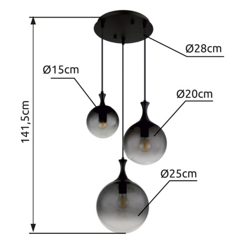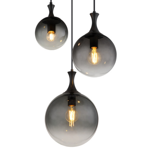 Стилен пендел от серията Dalton, изработен от черен цвят кръгла метална основа и три опушени стъклени чашки. Модерно решение за комфортното осветление във вашия хол, трапезария, хотел и ресторант.