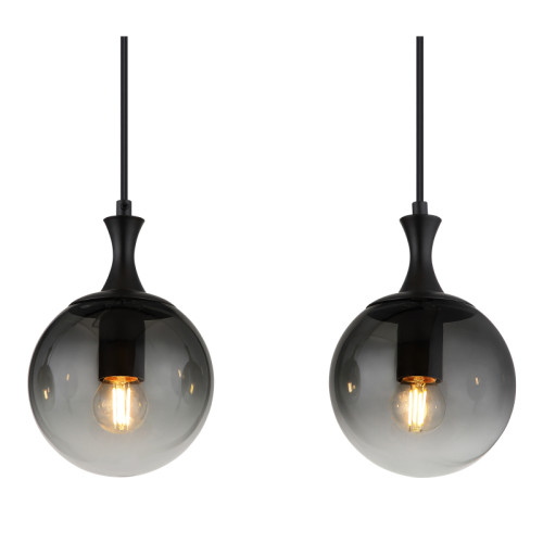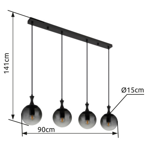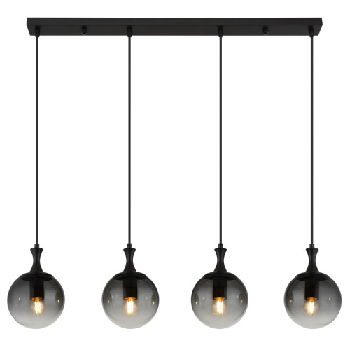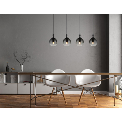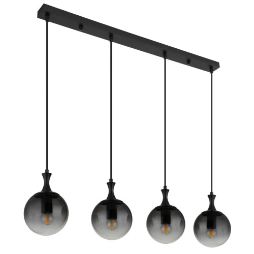 Стилен пендел от серията Dalton, изработен от черен цвят правоъгълна метална основа и четири опушени стъклени чашки. Модерно решение за комфортното осветление във вашия хол, трапезария, хотел и ресторант.