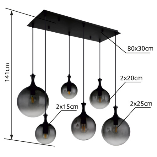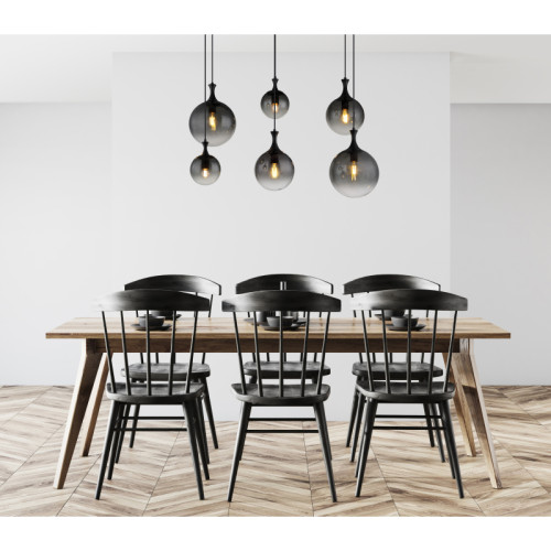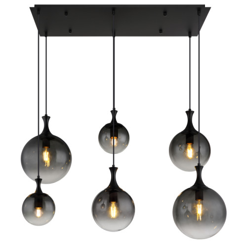 Стилен пендел от серията Dalton, изработен от черен цвят правоъгълна метална основа и шест опушени стъклени чашки. Модерно решение за комфортното осветление във вашия хол, трапезария, хотел и ресторант.
