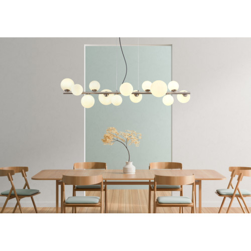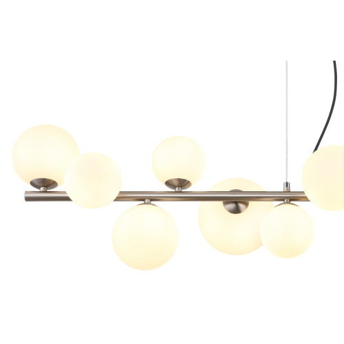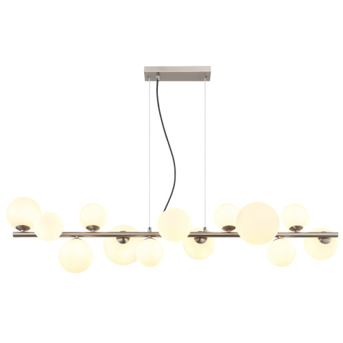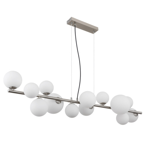 Модерен пендел със стилен дизайн от серията Riha, изработен от цвят матиран никел метална основа и метално рамо с тринадесет сферична форма стъклени чашки в бял цвят. Оригинално предложение за комфортното осветление във вашия хол, трапезария, хотел и ресторант.