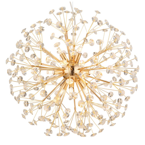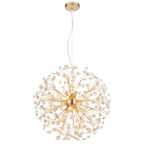 Оригинален пендел от серията Katrina, изработен от метална основа и висящо сферично тяло от златиста метална конструкция с красива декорация от прозрачни кристали К9 и девет източника на светлина на цокъл G9. Стилна лампа, подходяща за интериорното осветление на вашия хол, трапезария, спалня, хотел и заведение.