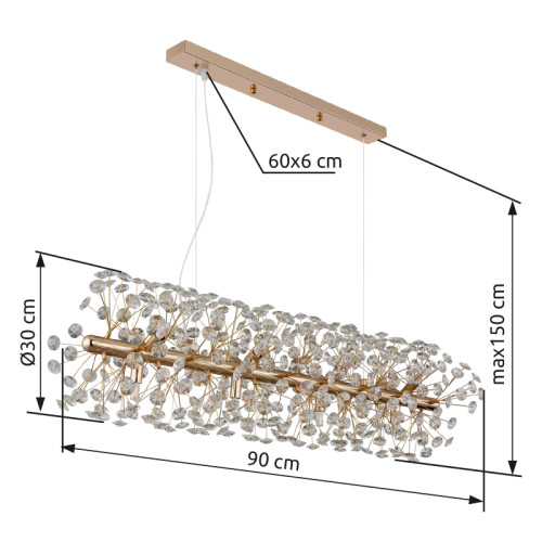Оригинален пендел от серията Katrina, изработен от златист цвят метална основа с красива декорация от прозрачни кристали К9 и дванадесет източника на светлина на цокъл G9. Стилна лампа, подходяща за интериорното осветление на вашия хол, трапезария, спалня, хотел и заведение.
