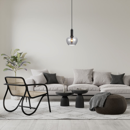 Стилен пендел от серията Stabla, изработен от черен цвят метална основа и опушена стъклена чашка. Модерна лампа, подходяща за комфортното осветление на вашия хол, трапезария, спалня, хотел и заведение.