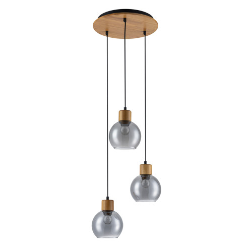 Елегантен пендел с оригинален дизайн, изработен от черен цвят метална основа с декоративни натурални дървени елементи и три опушени стъклени чашки. Модерна лампа, подходяща за комфортното осветление на вашия хол, трапезария, спалня, хотел и заведение.