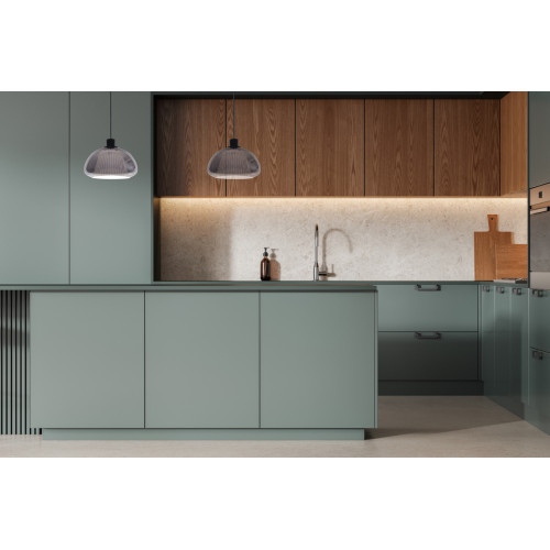 Модерен пендел от серията Apiro, изработен от черен цвят метална основа и опушен цвят стъклена чашка с бял оребрен пластмасов разсейвател отвътре. Стилна висяща лампа, подходяща за осветлението на вашия хол, трапезария, спалня, хотел и ресторант.