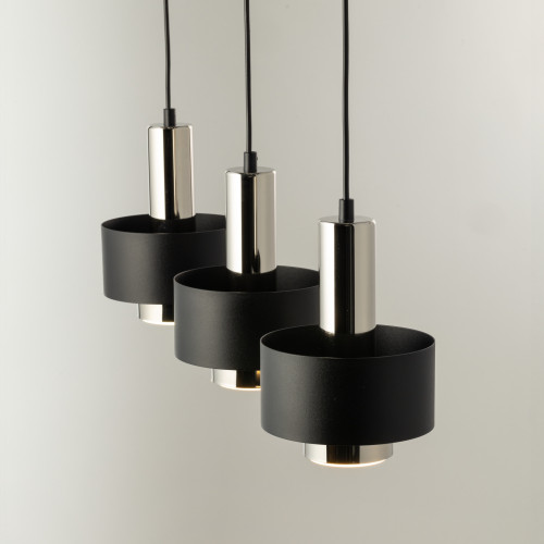 Оригинален пендел с минималистичен дизайн от серията Rif Lux, изработен от черен цвят правоъгълна стоманена основа и три стоманени глави в сребрист цвят с декоративни черни стоманени чашки в цилиндрична форма. Модерно предложение за стилното осветление във вашия хол, трапезария, спалня, хотел и заведение.
