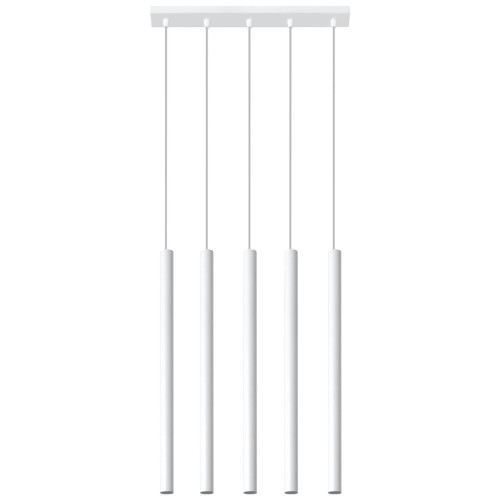Съвременен пендел със стилен дизайн от серията Pastelo, изработен от правоъгълна метална основа и пет бял цвят цилиндрични метални тела. Практично решение за интериорното осветление във вашия дом, офис, хотел и заведение.
