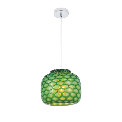 Стилен пендел с оригинален дизайн от серията Felicia, изработен от цвят матиран хром метална основа и атрактивна орнаментна стъклена чашка в зелен цвят. Висяща лампа, подходяща за комфортното осветление на вашия хол, трапезария, спалня, хотел и заведение.