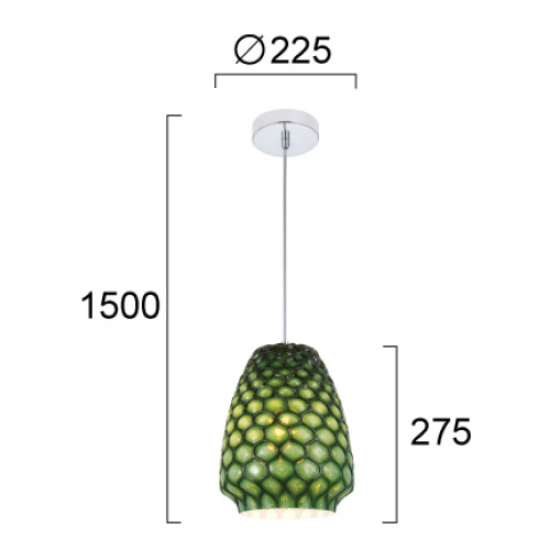 Стилен пендел с оригинален дизайн от серията Felicia, изработен от цвят матиран хром метална основа и атрактивна орнаментна стъклена чашка в зелен цвят. Висяща лампа, подходяща за комфортното осветление на вашия хол, трапезария, спалня, хотел и заведение.