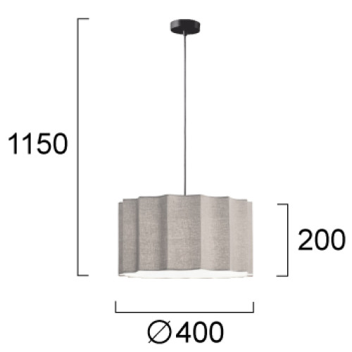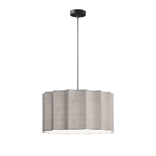 Модерен пендел в оригинален стил от серията Wavy, изработен от черен цвят метална основа и сив цвят цилиндрична форма ленена шапка с вълнообразен дизайн. Стилно предложение за комфортното осветление на вашия хол, трапезария, спалня, хотел и заведение.