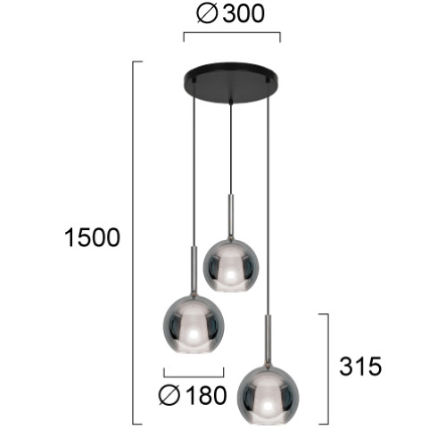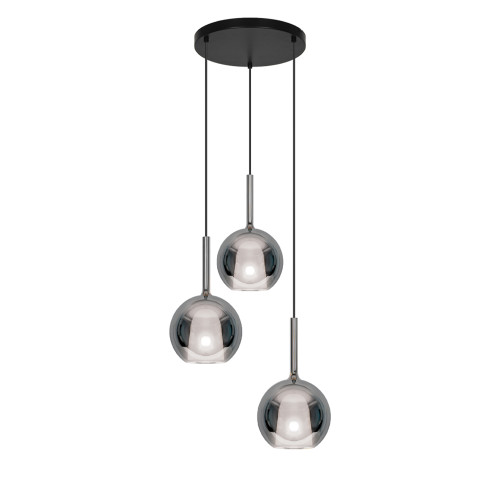 Стилен пендел с модерен дизайн от серията Ramona, изработен от черен цвят метална основа и три сферични огледални стъклени чашки в цвят хорм отвът и бял във вътрешността. Оригинална лампа, подходяща за комфортното осветление на вашия хол, трапезария, спалня, хотел и заведение.