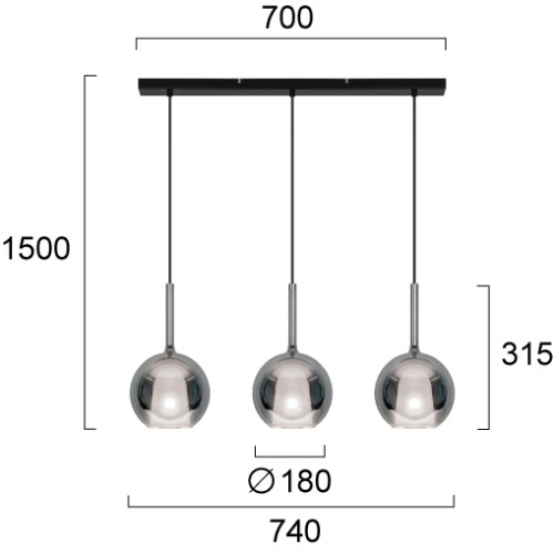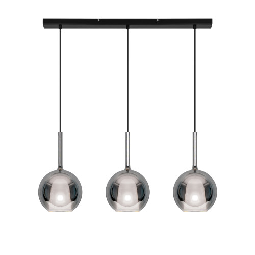 Стилен пендел с модерен дизайн от серията Ramona, изработен от черен цвят метална основа и три сферични огледални стъклени чашки в цвят хорм отвът и бял във вътрешността. Оригинална лампа, подходяща за комфортното осветление на вашия хол, трапезария, спалня, хотел и заведение.