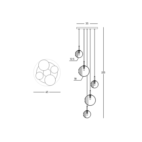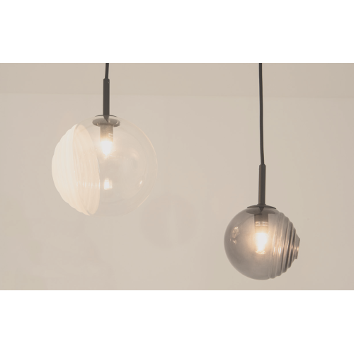 Оригинален пендел с модерен дизайн, изработен от цвят черен мат метална основа и пет асиметрични стъклени сфери в опушен, прозрачен и матово бял цвят с ефектно оребряване от едната страна на цокъл G9. Чудесно предложение за интериорното осветление на вашия хол, трапезария, хотел и ресторант.