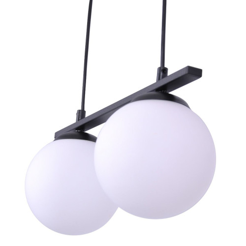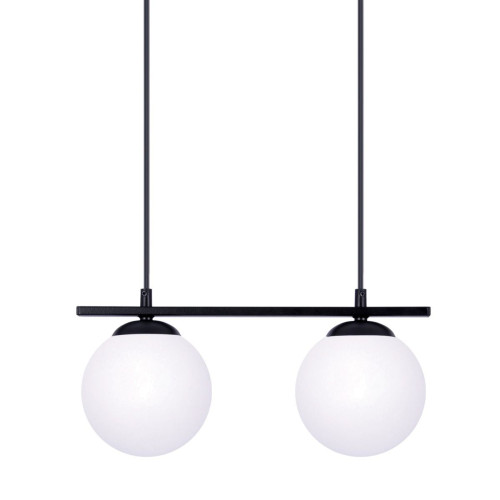 Модерен пендел със стилен дизайн от серията Globe, изработен от черен цвят метална основа и два бял цвят стъклени разсейватели в сферична форма. Качествена лампа, подходяща за комфортното осветление във вашия хол, трапезария, спалня, хотел или заведение.