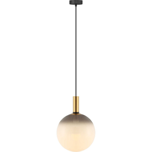 Оригинален пендел от серията Nua, изработен от черна метална основа и сферична форма стъклена чашка в бял цвят с леко опушване в горния край и златист цвят декоративен метален детайл. Стилно предложение за комфортното осветление на вашия съвременен хол, трапезария, спалня, хотел и заведение.
