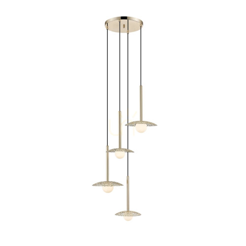 Стилен пендел с оригинален дизайн от серията Nicosia, изработен от златист цвят метална основа и четири метални чашки с плетка като дантела и бял цвят сферични стъклени разсейватели. Модерно решение за интериорното осветление на вашия хол, трапезария, спалня, хотел и заведение.