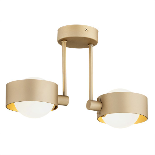 Модерен пендел от серията Massimo Plus, изработен от златист цвят кръгла метална основа с две рамена и цилиндрични метални чашки, държащи опал стъклени разсейватели в сферична форма. Оригинална лампа, подходяща за интериорното осветление във вашия стилен хол, трапезария, спалня, хотел и заведение.