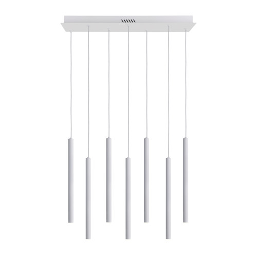 Стилен светодиоден пендел от серията Valdes, изработен от бял цвят правоъгълна метална основа и седем цилиндрични алуминиеви тела с акрилни разсейватели и вграден 35W LED с възможност за промяна на цветната температура чрез превключвател от 3000К до 6000К. Качествена лампа, подходяща за комфортно осветление на вашия хол, трапезария, офис, хотел и заведение.