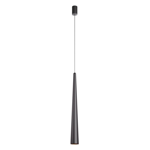 Модерен светодиоден пендел със стилен дизайн от серията Botera, изработен от матово черен цвят алуминиева основа с конусовидно алуминиево тяло и прозрачна леща от PMMA под ъгъл от 36° с вграден 10W 3000K LED. Тялото е с вграден димируем TRIAC драйвер. Качествена висяща лампа, подходяща за интериорното осветление на вашия хол, трапезария, спалня, хотел или заведение.