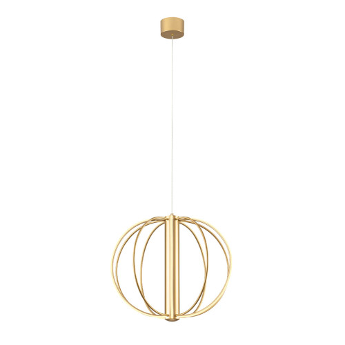 Оригинален светодиоден пендел от серията Moss, изработен от матово златист цвят метална основа и висящо сферично тяло от извити алуминиеви ленти с опал бял силиконов разсейвател и оптика под ъгъл от 120° с вграден 41W, 3000К LED. Тялото е с вграден димируем TRIAC драйвер. Модерно предложение за комфортното и стилно осветление на вашия хол, трапезария, спалня, хотел и заведение.