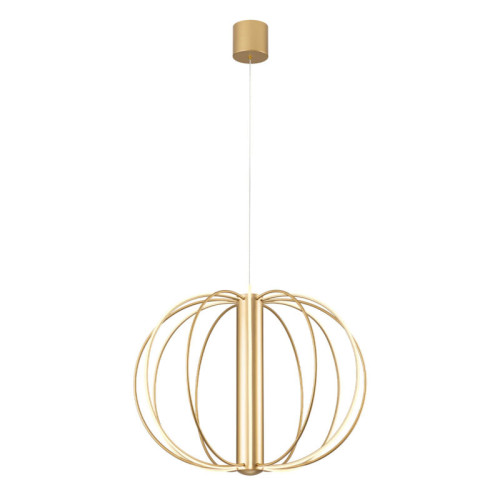 Оригинален светодиоден пендел от серията Moss, изработен от матово златист цвят метална основа и висящо сферично тяло от извити алуминиеви ленти с опал бял силиконов разсейвател и оптика под ъгъл от 120° с вграден 72W, 3000К LED. Тялото е с вграден димируем TRIAC драйвер. Модерно предложение за комфортното и стилно осветление на вашия хол, трапезария, спалня, хотел и заведение.