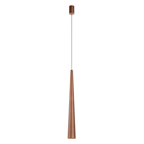 Модерен светодиоден пендел със стилен дизайн от серията Botera, изработен от цвят античен мед алуминиева основа с конусовидно алуминиево тяло и прозрачна леща от PMMA под ъгъл от 36° с вграден 10W 3000K LED. Тялото е с вграден димируем TRIAC драйвер. Качествена висяща лампа, подходяща за интериорното осветление на вашия хол, трапезария, спалня, хотел или заведение.