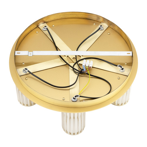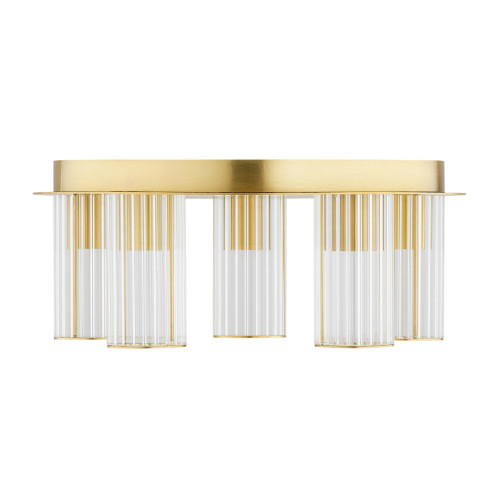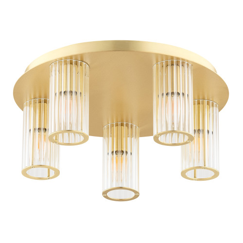 Съвременен плафон от серията Hampton, изработен от месингова основа и пет набраздени прозрачни стъклени чашки в цилиндрична форма. Стилно предложение за интериорното осветление на вашия хол, трапезария, спалня, коридор, хотел и ресторант.