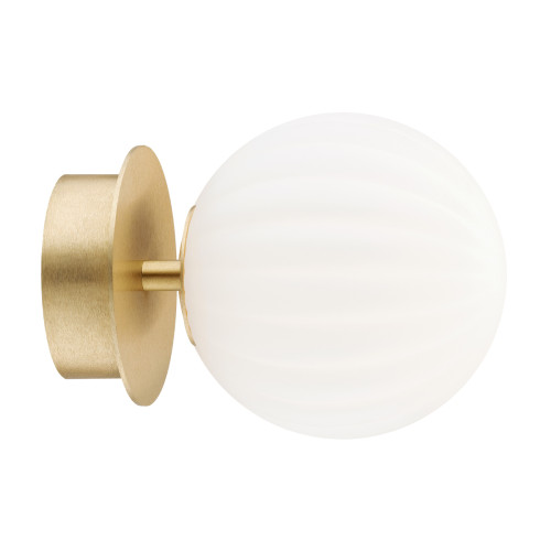 Стилен плафон от серията Paloma, изработен от кръгла месингова основа с рамо и сферична форма чашка от опал мат набраздено стъкло. Тялото може да се монтира и на стена като аплик. Изискано предложение за качественото и комфортно осветление на вашия хол, трапезария, спалня, коридор, хотел и ресторант.
